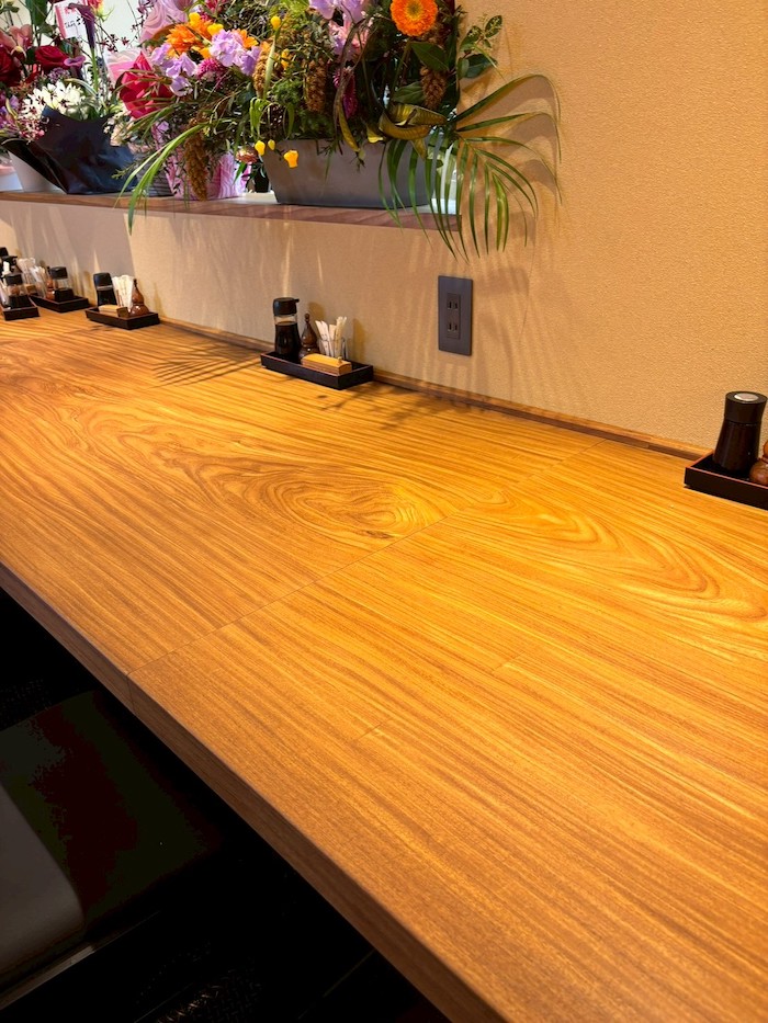12/9に御殿場駅前へ移転オープンした「きんかぶ」さんのテーブル、カウンター、お皿や手を置くすべての板の材料を