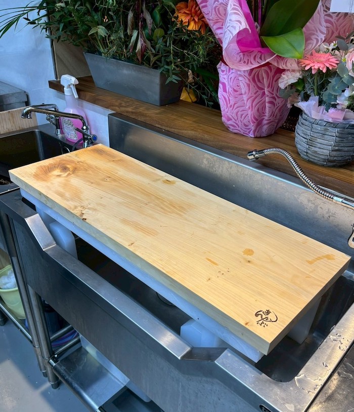 イチョウのまな板にはレーザーで店名を入れました。オーナーに使っていただくものです。