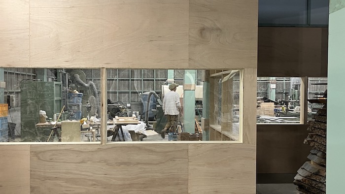 多くの方にラ・ルースの仕事を知っていただけたらと、木工所の見学を希望する方々に危険がない状態で職人の作業が見られる窓を設置しました。