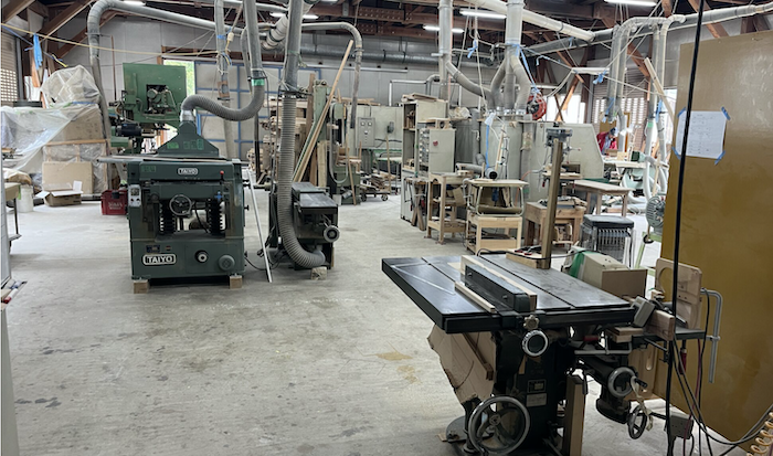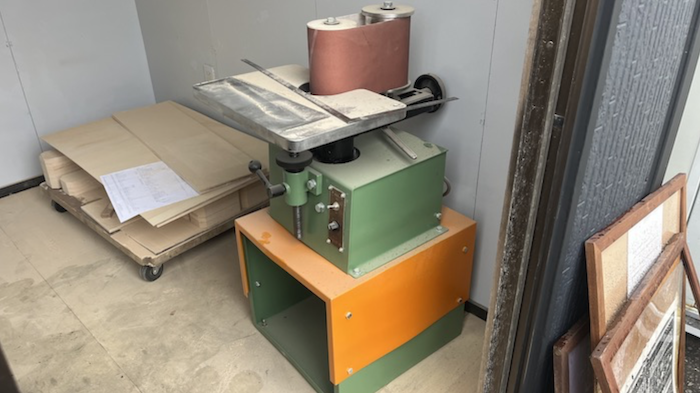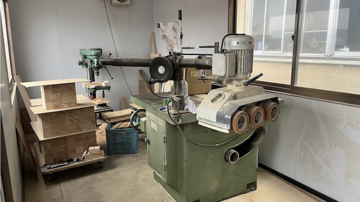 機械屋さんや家具職人さんからろくろや昇降盤、プレーザーを貸していただいたり譲り受けたりし、片付けが進む工場のプレハブの中ながら、体裁が少し整いました。