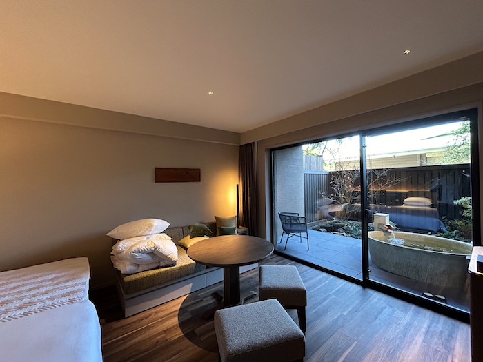 外には露天風呂、木質の床。調度品も落ち着いたトーンの色調でまとめられた、大人のムード。