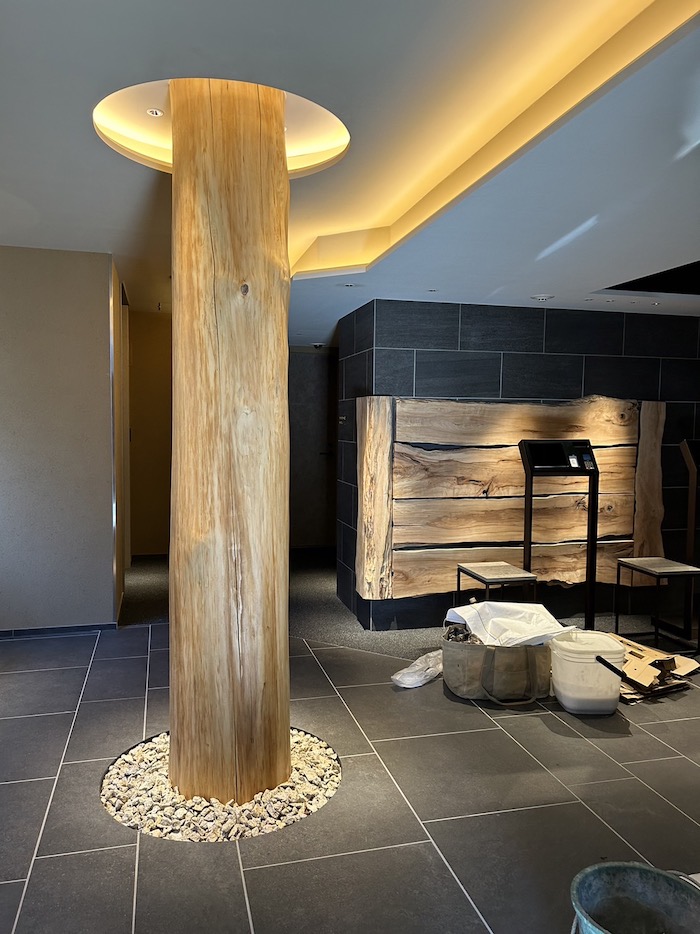 この壁面オブジェの前方には、立派な1本の丸太を配置しました。
