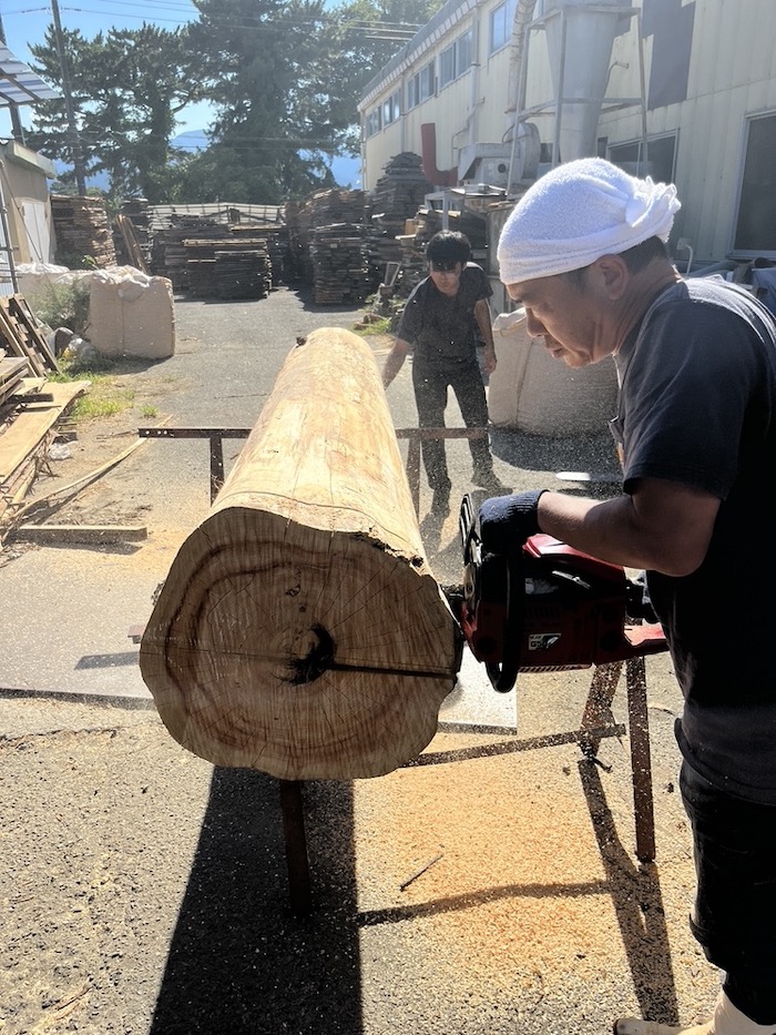 写真右手の手ぬぐい巻きの方が製材屋さんです(ちなみに場所はラ・ルース工場裏手です)。