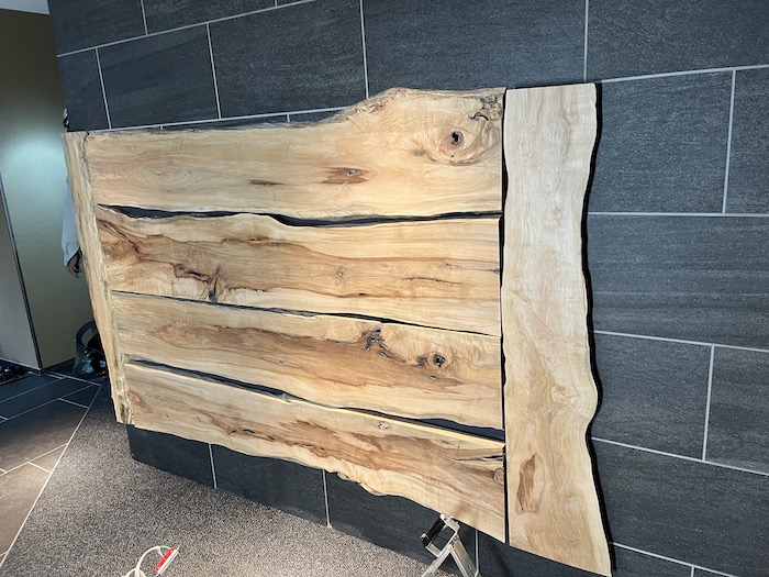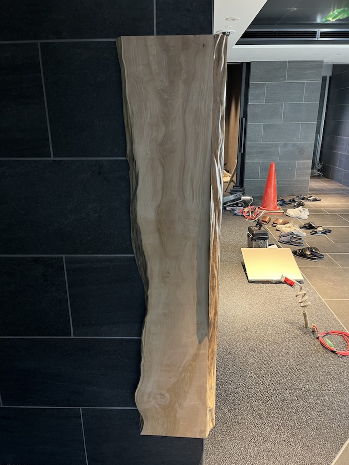 製材した板を弊社工場でホテル側のデザイナーさんに確認していただき、ダイナミックなものが製作できました。