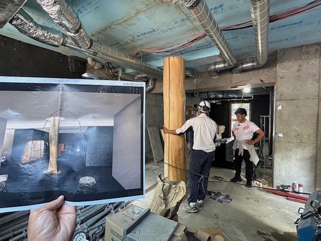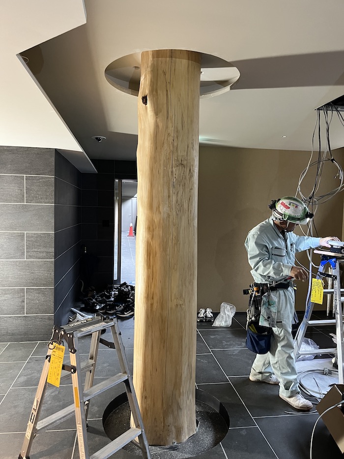 新規オープンのホテルから、建設前の敷地開発時に伐り出した材料で、ホテル内の