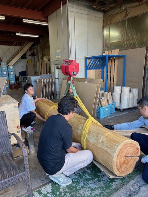 丸太をクレーンで吊るところ(手前の後ろ姿は社長です)。