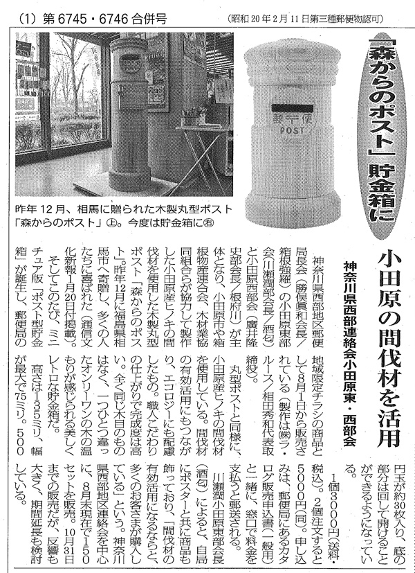 通信文化新報(2014/9/22)に“小田原の間伐材を活用したアイテム”としてポスト型貯金箱をピックアップした記事が掲載されました!昨年12月に相馬市に送られた木製丸型ポストのミニチュア版として作成されたポスト型貯金箱。じわじわと注目を集めています!