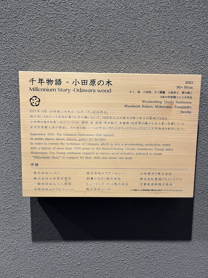 小ホール入口には、2021年のホール開業に合わせて地元・小田原箱根の若手木工職人が製作した木工アートが展示されています。