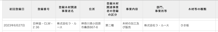 このほど株式会社ラ・ルースは、この法律に基づいた木材関連事業者であるという認定を受けました。