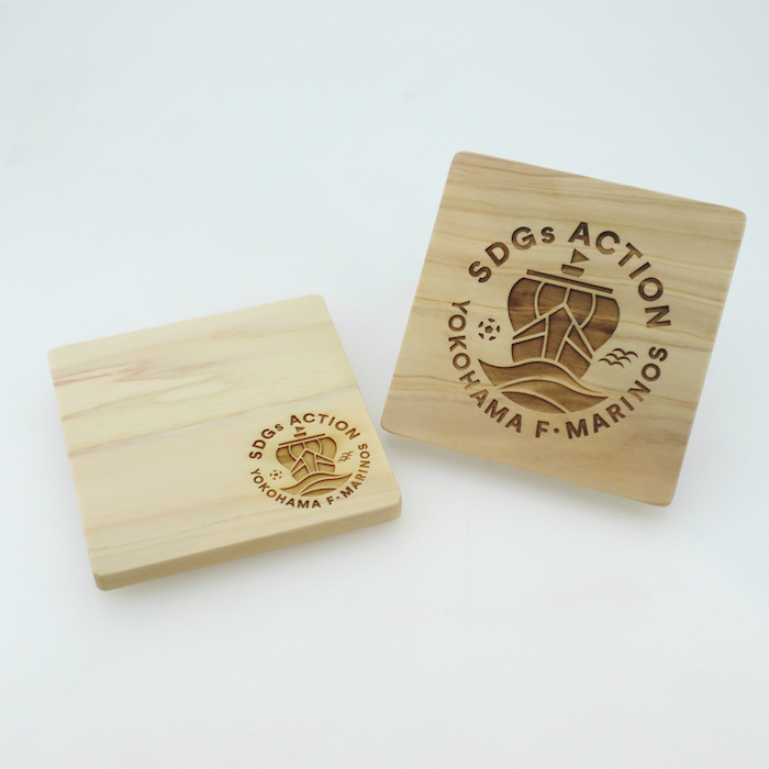 神奈川県が誇るサッカークラブ、横浜F・マリノス様からのご依頼で、間伐材ヒノキのコースターを製作しました。