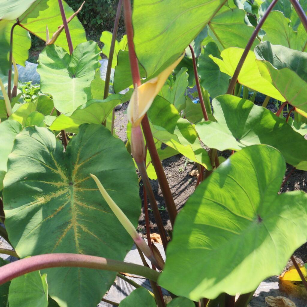 先日は、十数年に一度しか咲かないというサトイモの花を見せてくださいました(中央の黄色が花)。