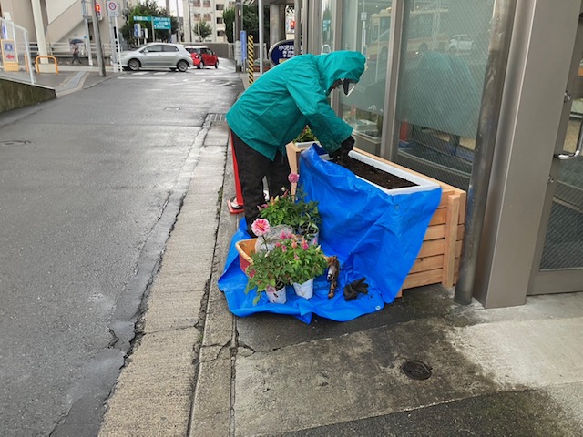 納品後、林業会社の方がさっそく鉢植えの花を生け込んでくださいました。