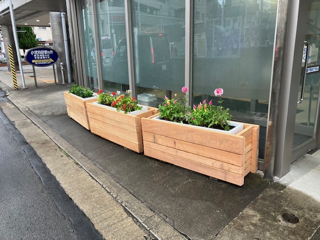 小田原・箱根産の間伐材ヒノキ製プランターで、病院の外観に温かみがうまれました。