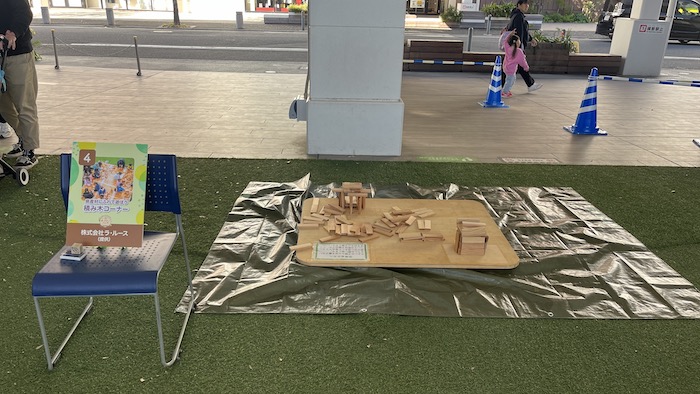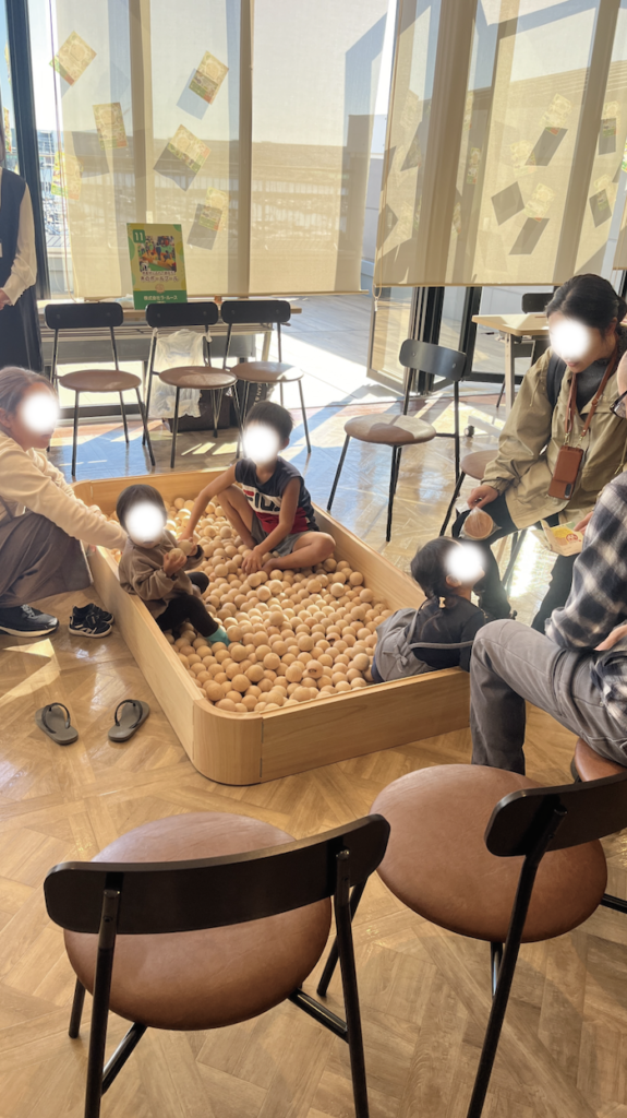 ヒノキ玉プールとかまぼこ積み木、木はがきのブースを拝見しました。