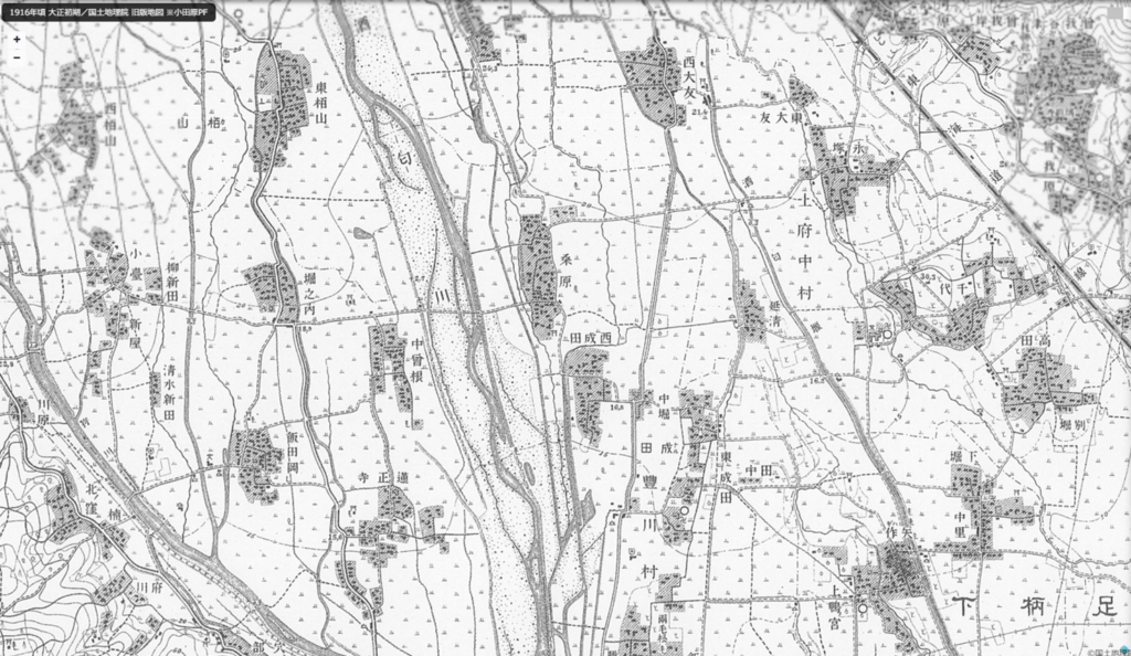 地図で読み取る限り、1916年から現在にかけて、宅地化は進んでいますが、昔から水田が多い地域のようです。※1)