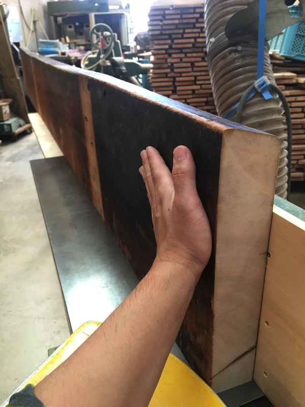 今回は長年使われてきたその味を生かすため、反りやへこみなどをそのままに加工していく作業が必要です。