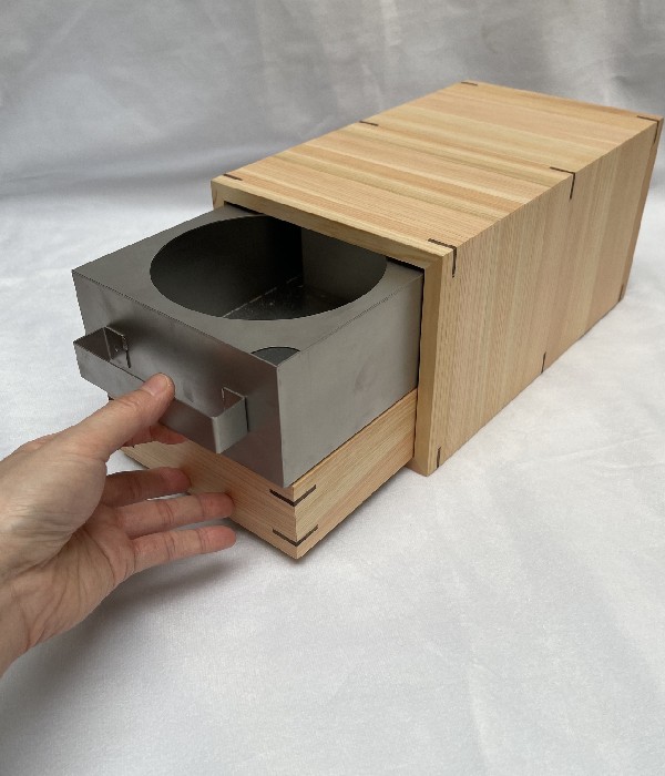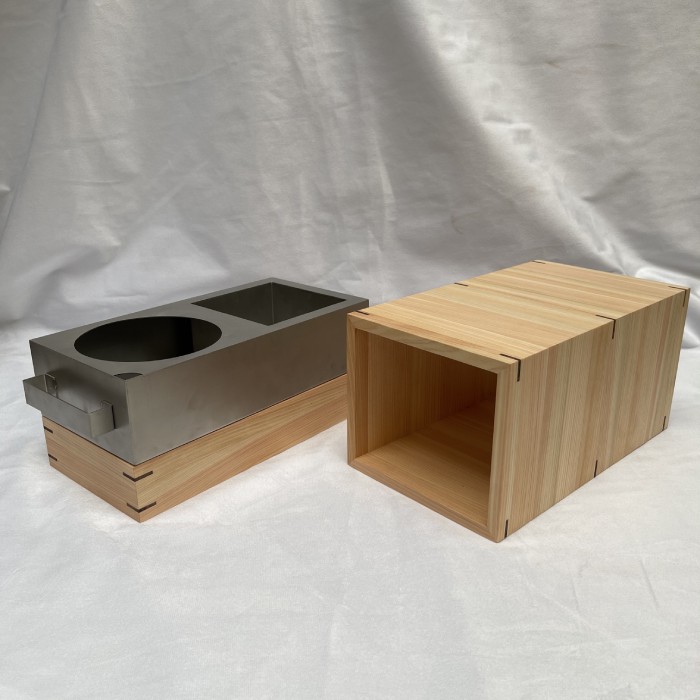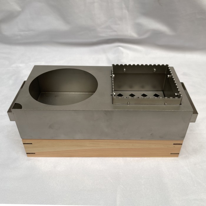 木材とステンレスを使い、ご家庭や自家用としてアウトドアなどでも利用できる小型の炭台を開発。台には火口が2箇所あり、一つは炭火による直火、もう一つは小鍋などによる茹でる、煮る、炊く、温めるなどの調理が可能になっています。