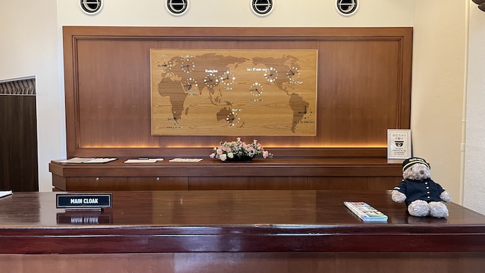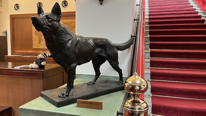 回転ドアをするりと抜け、以前納品した世界時計と三代目社長の愛犬・フワちゃんの像にあいさつをして、