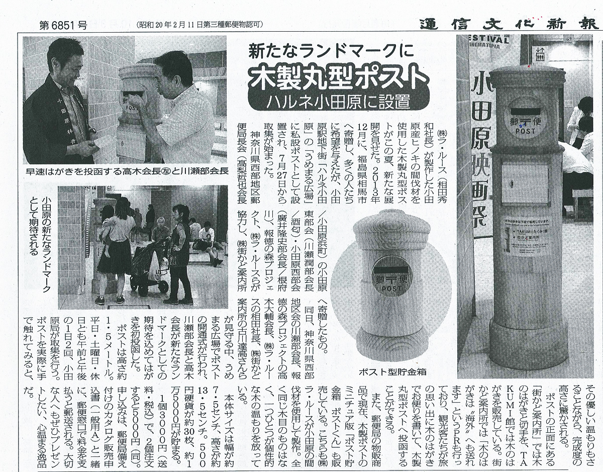 今年8月ハルネ小田原に設置された木製丸型ポスト。 全国の郵便局にてご覧頂ける通信文化新報に取り上げられました! ▲クリックで拡大表示されます。