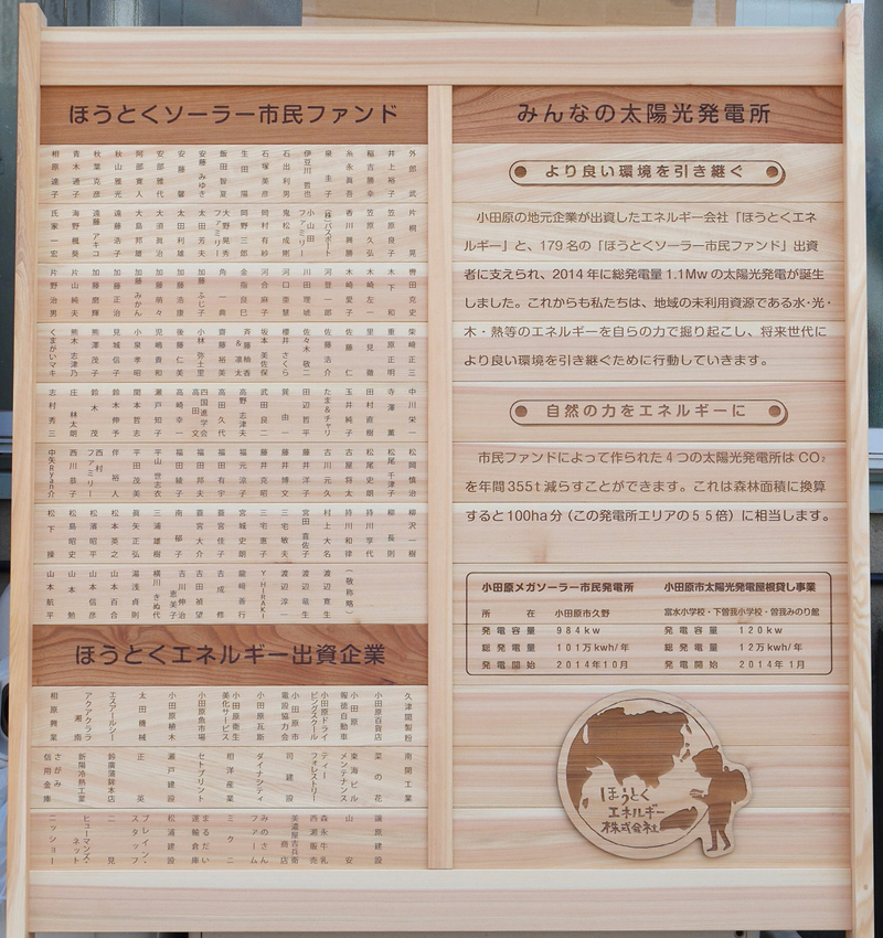 再生可能エネルギーの普及促進に向けて小田原市の市民や地元企業などが出資する企業「ほうとくエネルギー」株式会社の皆様が小田原市久野の山林に大規模太陽光発電所(メガソーラー)を建設。その看板を弊社が作成しました。 竣工式の最後に列席者の皆様に除幕して頂きました。地場木材を使用したこの看板には、このプロジェクトに関わった方々の名前が刻まれています。