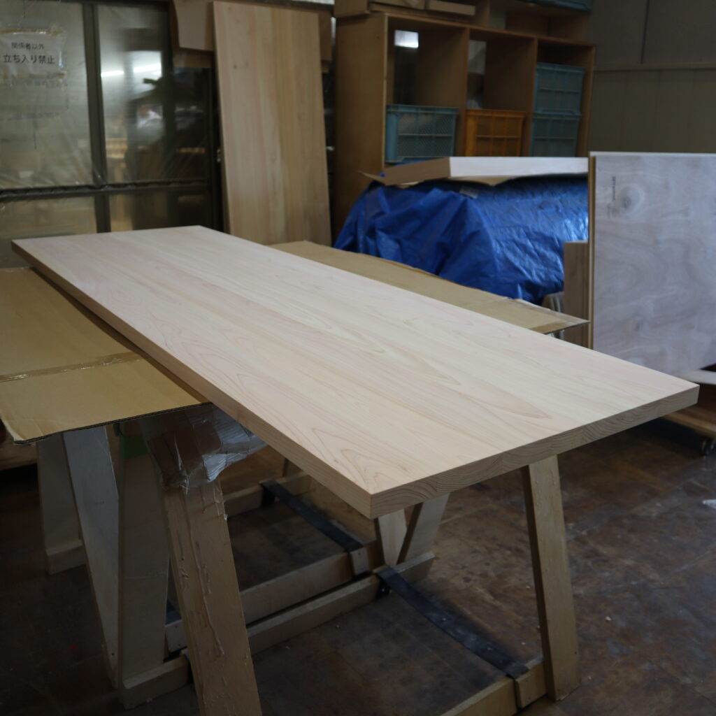 加工中、すでになめらかな手触りだったヒノキの天板