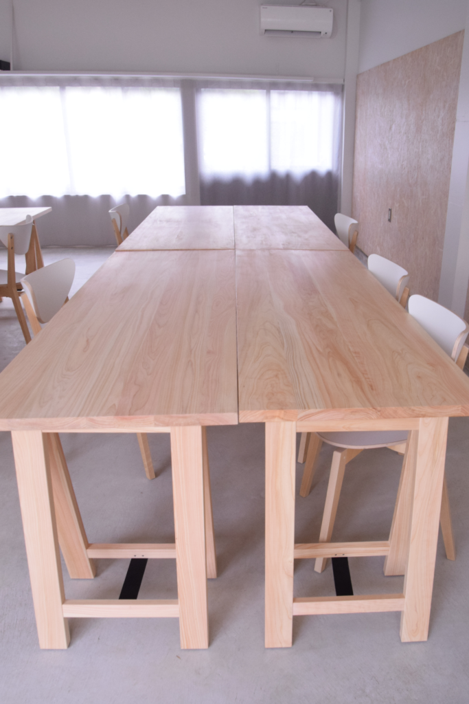 1階にはヒノキの天板と脚を8組、2階にはスギとケヤキの天板と、スギのカウンターテーブルを納めました。