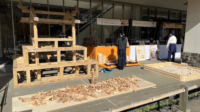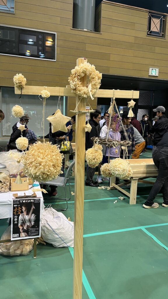 熱気であふれる会場には、様々な展示コーナーや削った木を使った作品が楽しく並んでいました。
