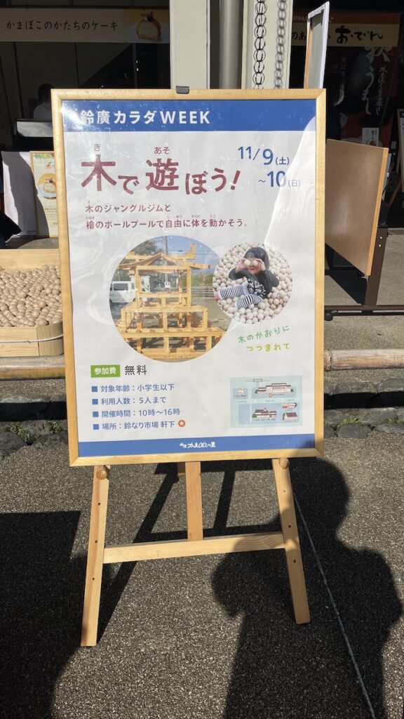 鈴廣さんでは、小田原林青会さんの木のジャングルジムと一緒に、かまぼこ積み木とヒノキ玉プールの