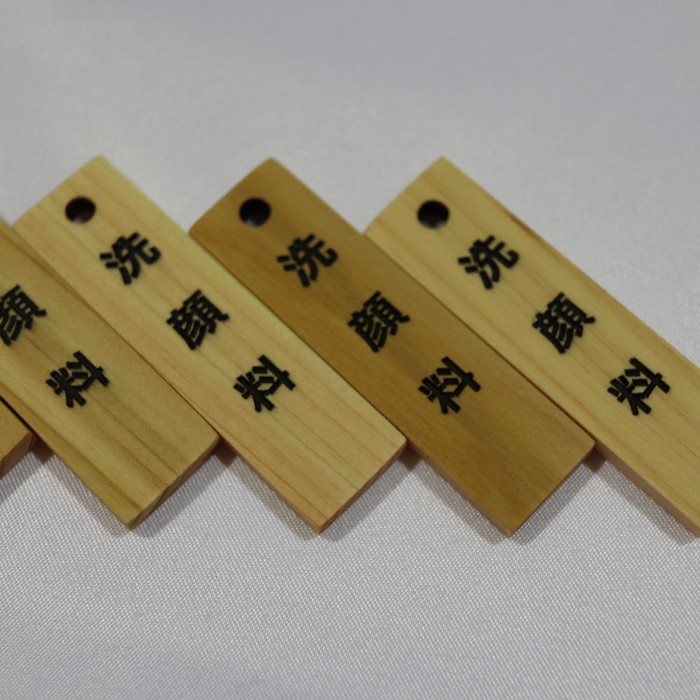 「洗顔料」「メイク落とし」と表記されている木札を各10枚作製いたしました。