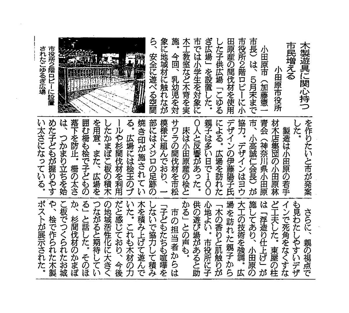 日刊木材新聞に5月末まで設置されていた「木っずスペース こゆるぎひろば」が取り上げられました。
