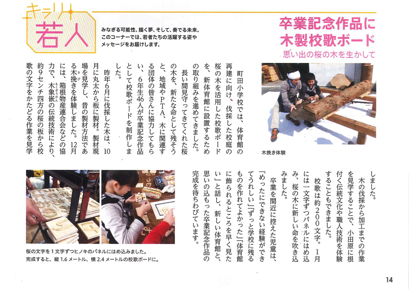 先日、最終段階の文字の貼り付けを行いました。こうして完成した町田小学校の校歌ボード。地元メディアからも注目を集めました。広報小田原に特集されました。3/15には新しくなった体育館の一般公開があり、この校歌ボードをご覧頂く事ができます。今まで体育館の無い中で知恵を出し合いながら頑張ってきた先生と生徒たち。ぴかぴかの体育館で迎える卒業式…感慨深いものがありますね!