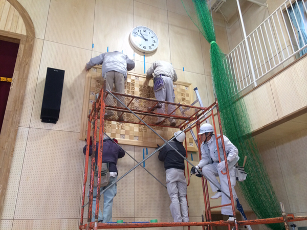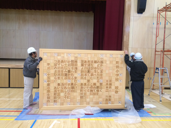 木材の加工から、6年生の生徒さん達も含め沢山の方々が携わった校歌ボードも設置。