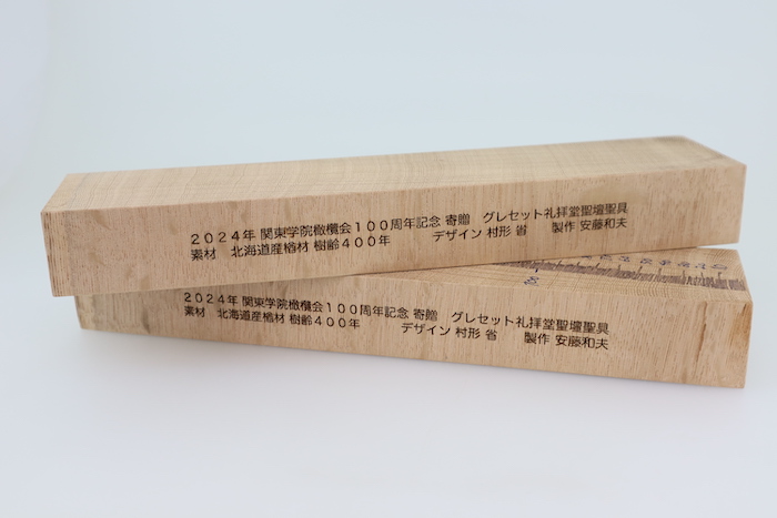 その中で安藤さんが手掛けられたチャペルの祭壇と椅子の材料を使い、関係者の方々にお渡しする記念品のご依頼を