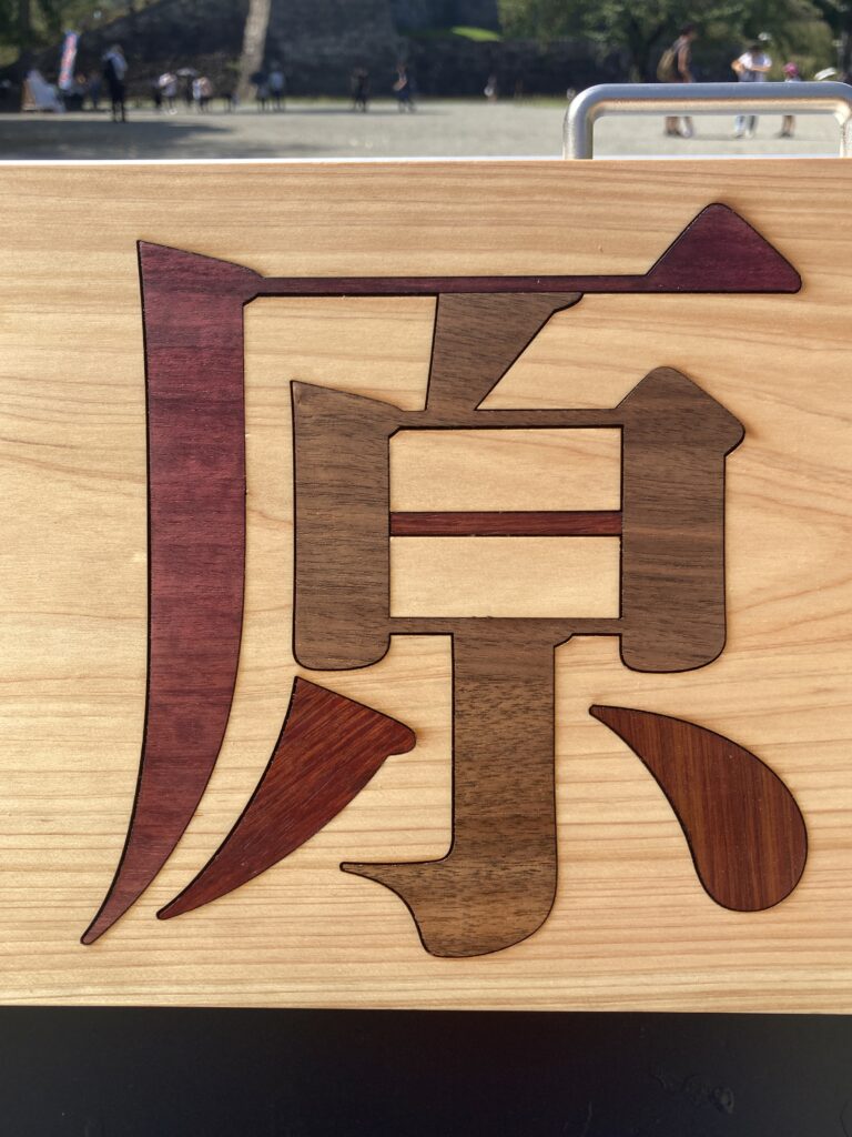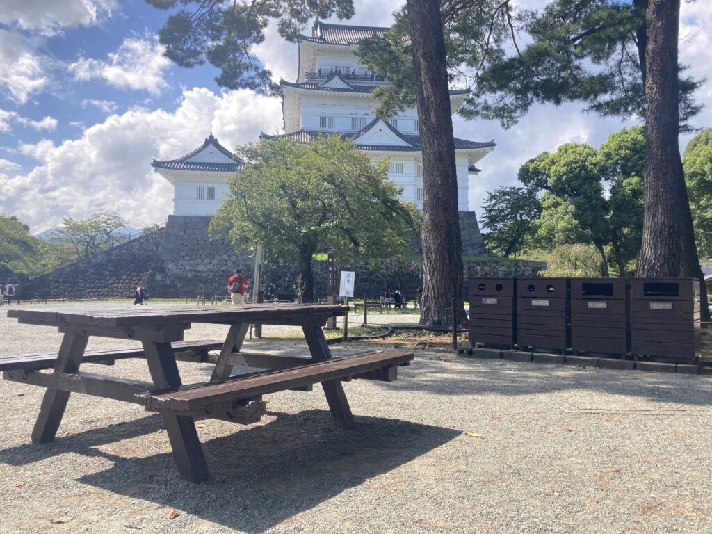 本丸広場ほか城址公園内には木製ベンチテーブルが複数台設置され、こちらは小田原の木の仲間・小田原林青会さんが作ったものです。