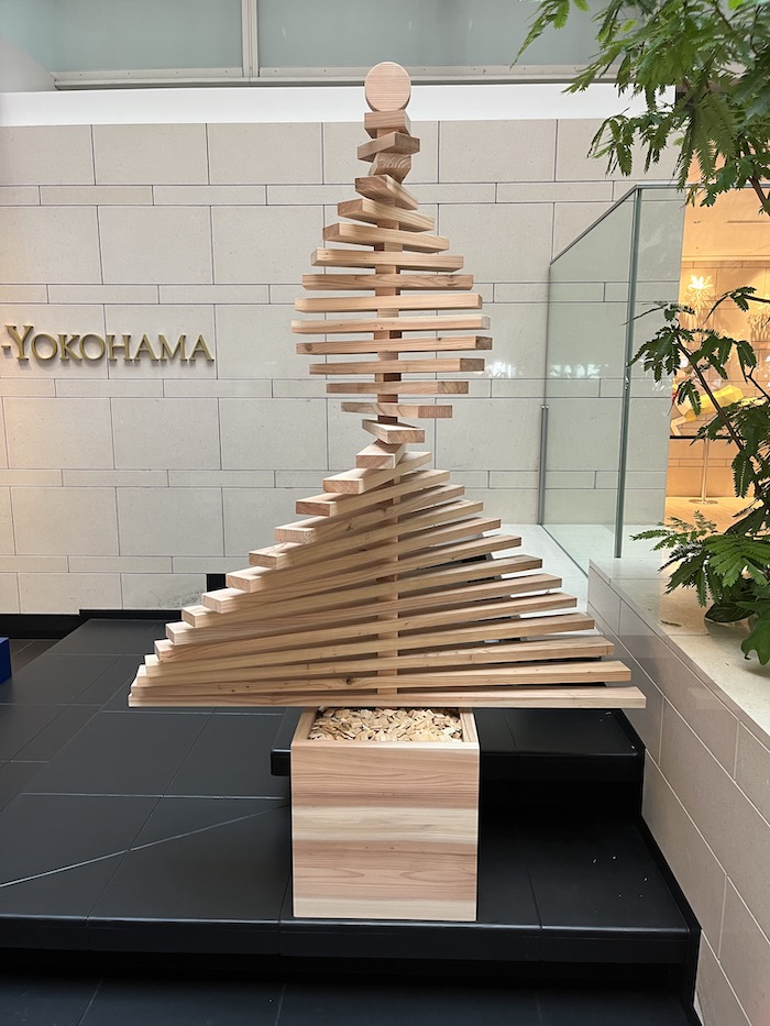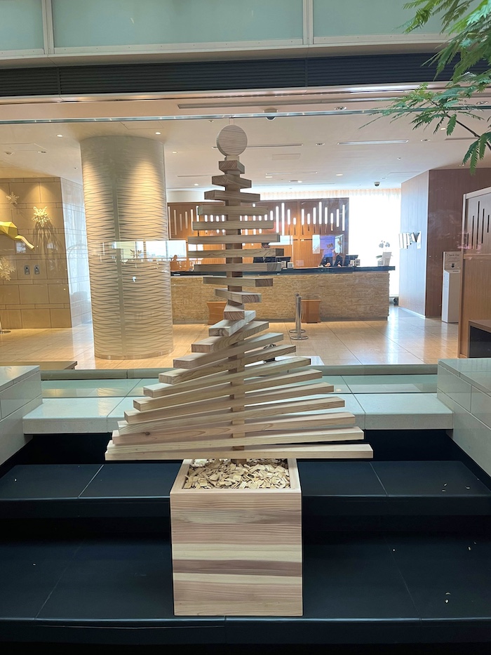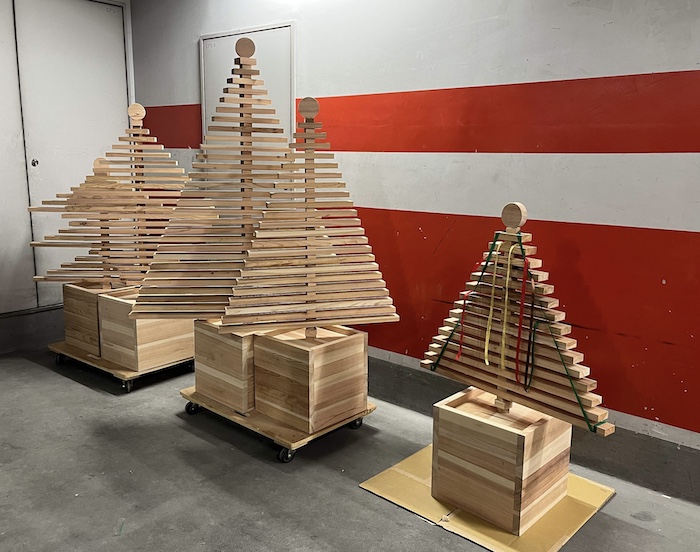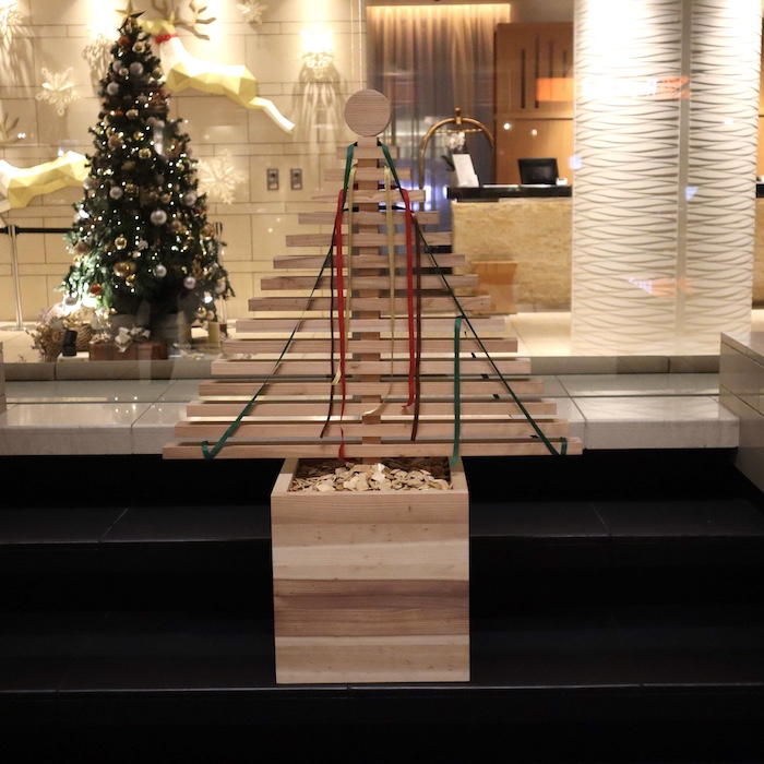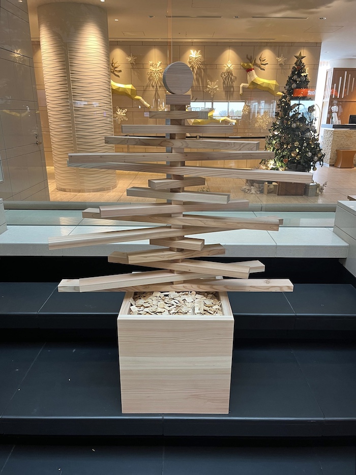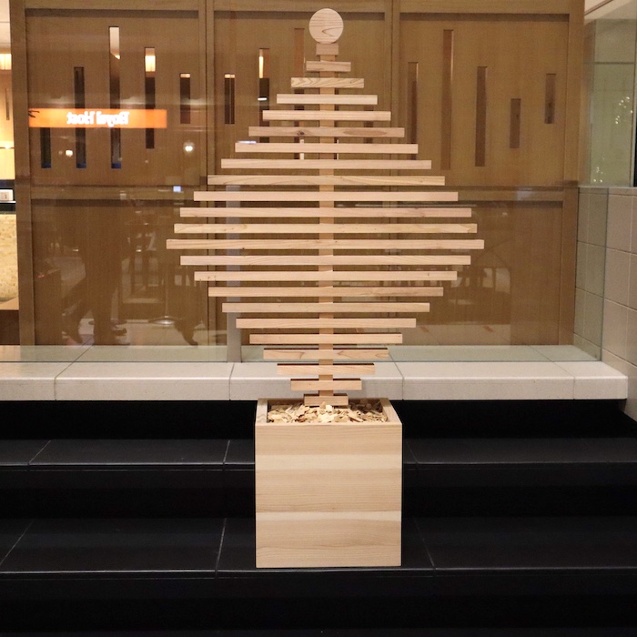 こちらは、リニューアルオープンの時期に合わせ、季節を感じるオブジェとして5パターン製作した木製ツリーです。