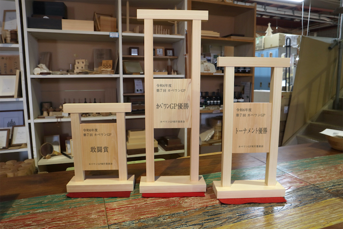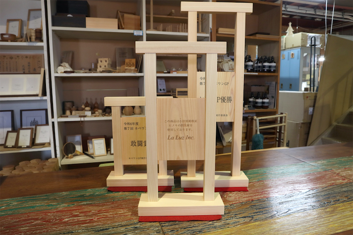 小田原箱根産間伐材ヒノキで作ったトロフィーです。
