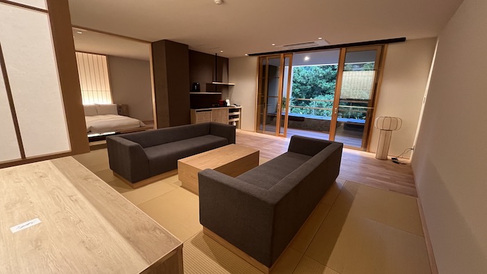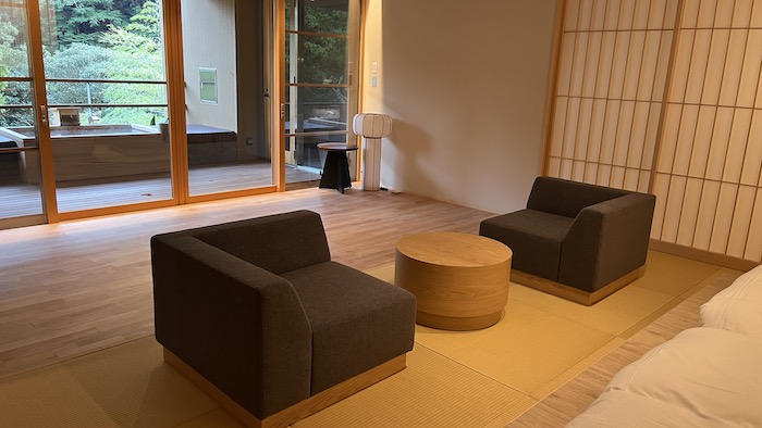 写真奥に、ラ・ルース製のヒノキ風呂が見えています。