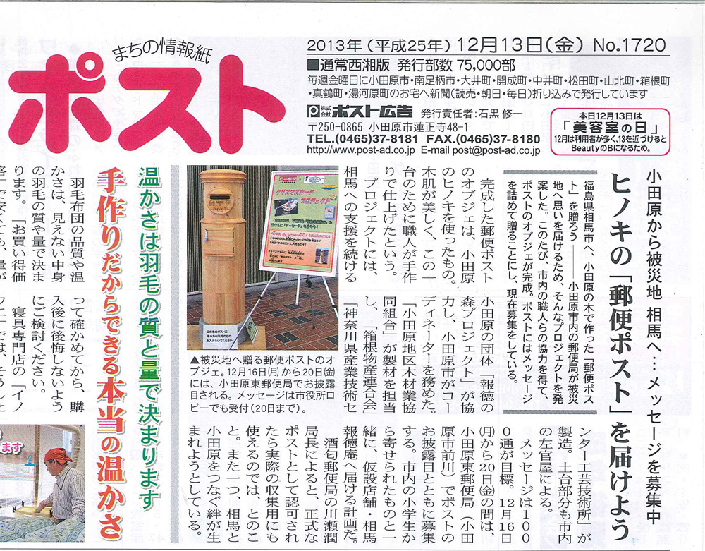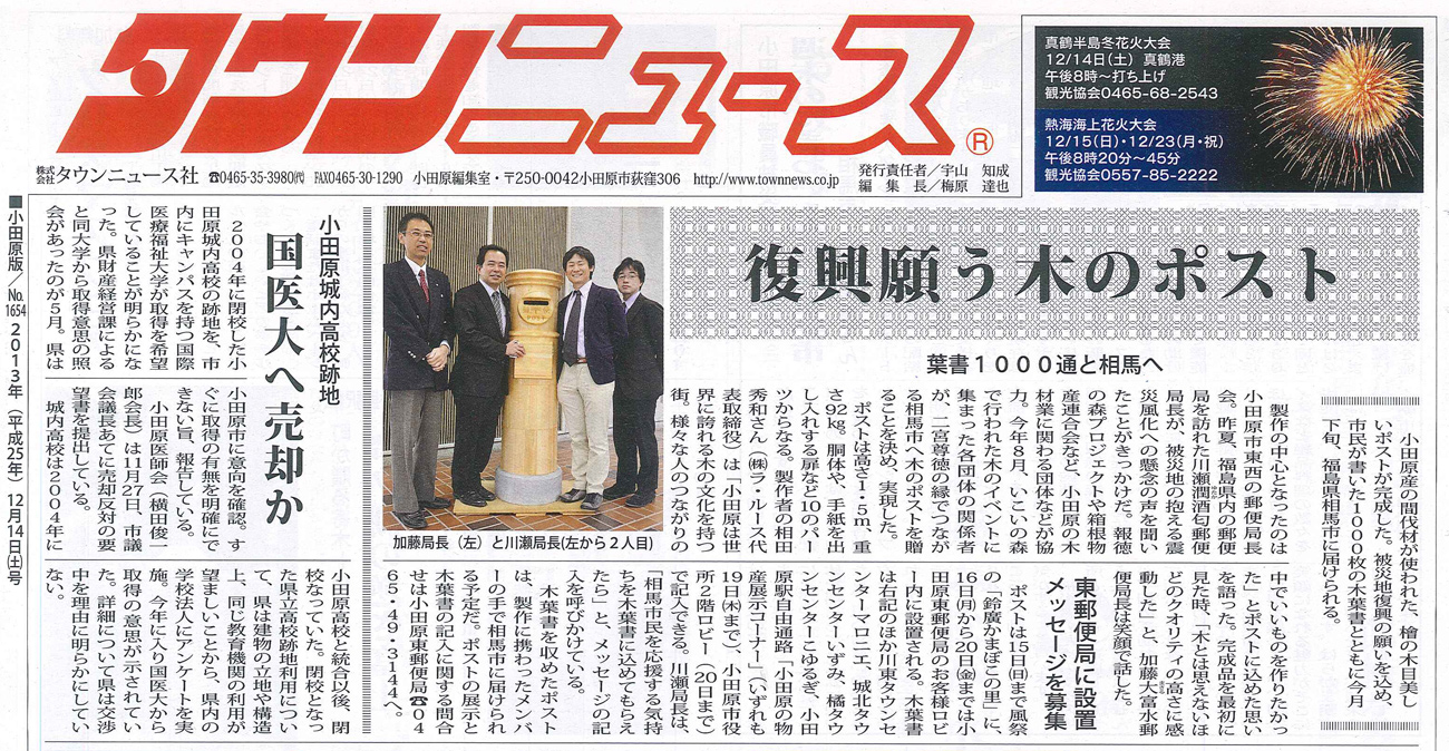 タウンニュースでは『復興願う木のポスト』として取り上げられ、製作に携わった関係者の想いと願いが書かれています。