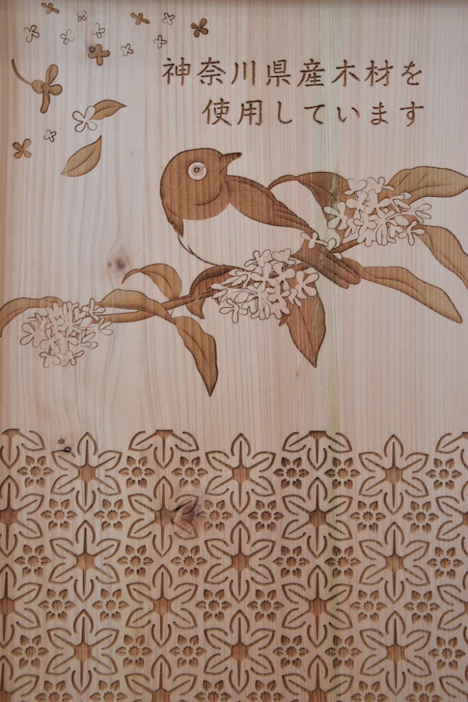 カウンターの仕切りには、大井町らしくひょうたんをはじめ、スイセンやメジロをあしらいました。