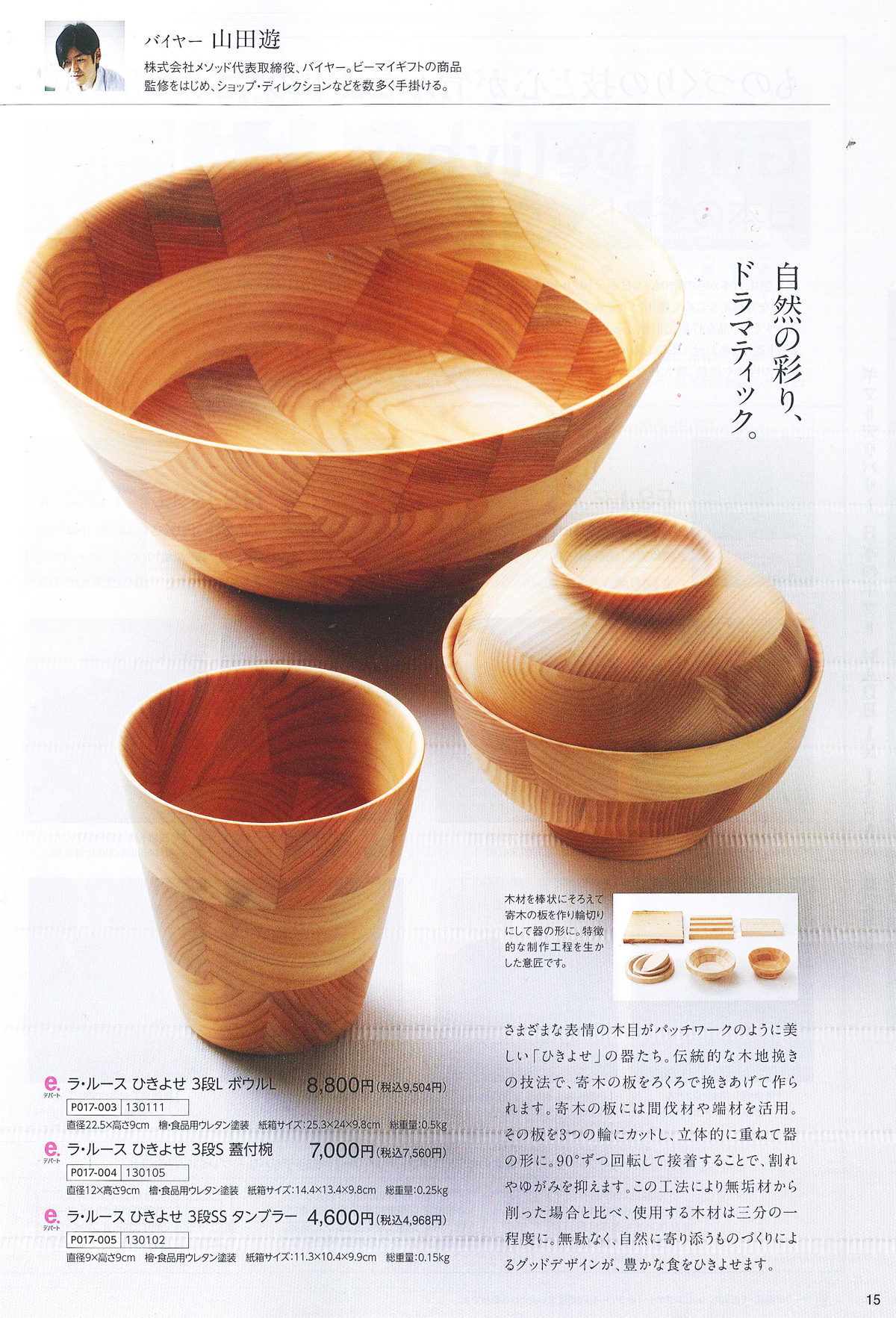 「西武ギフトカタログ」の2015年3月~8月のカタログに「ひきよせ」が紹介されています。紹介されているのはヒノキの3段シリーズ。2013年の東京ビジネスデザインアワードで出会った企業とデザイナーによる商品としてバイヤーの山田遊さんが紹介してくださいました。『さまざまな表情の木目がパッチワークのように美しい』と表現されているとおり、特にヒノキを使用したラインナップは木目の美しさが際立っています。