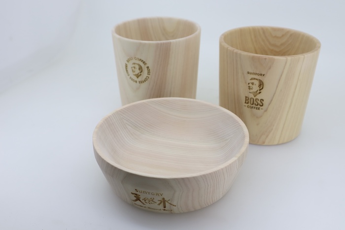 サントリーさんの育林材で生きてきたヒノキを使ったかき氷の器と、アイス・ホット両方に使えるコーヒーカップです。