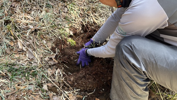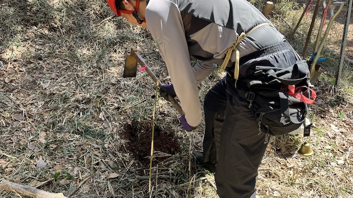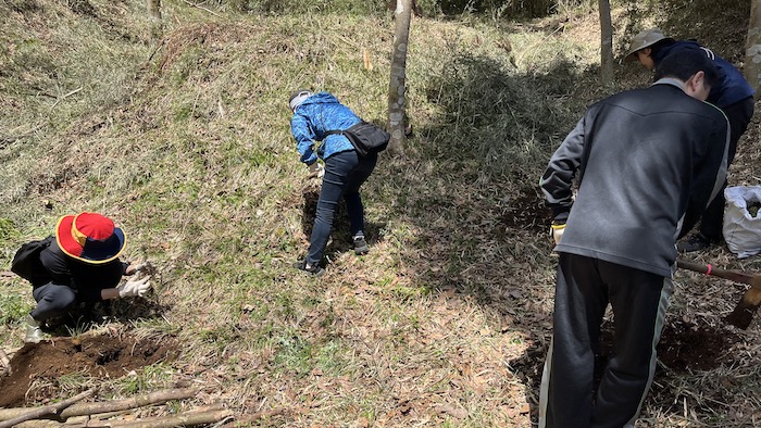 下草の片付け、伐倒、穴を掘り、苗を立てて土を盛るという一連の作業を、3時間弱。