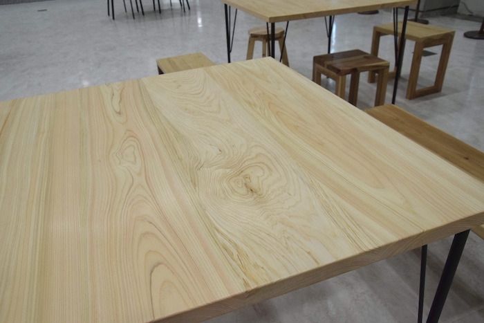 寸法やご予算を打ち合わせし、天板に小田原箱根産間伐材ヒノキを使ったテーブル4脚を作ることになりました。