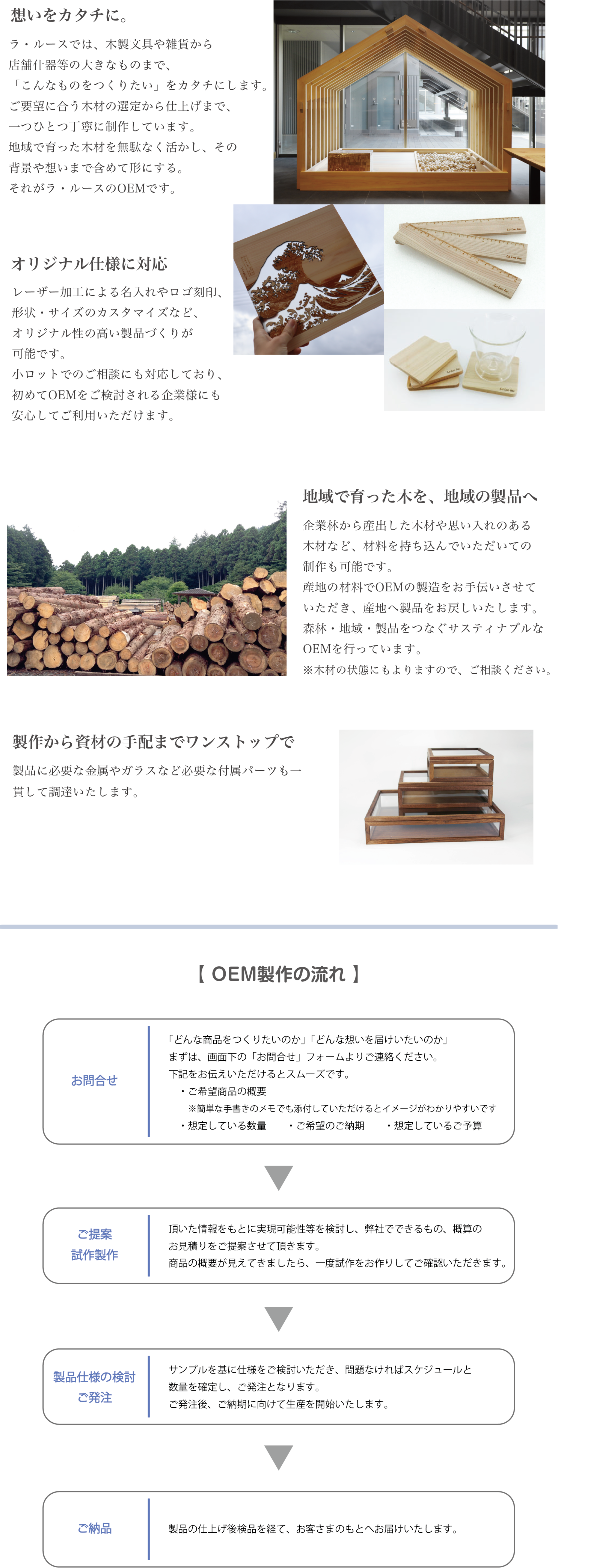ラ・ルースでは、国産材や産地指定材を活用し、素材の背景まで大切にしたサスティナブルなOEM製造を行っています。