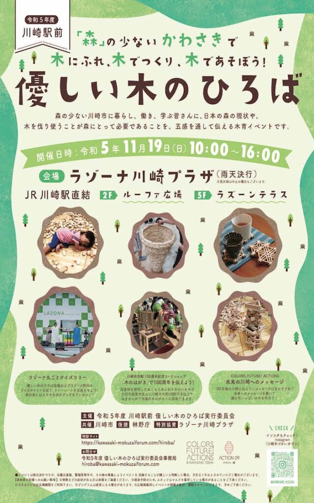 「森林面積の少ない川崎で、木に触れ木で遊ぶ」がテーマとなっており、「木んぎょすくい」や「木のボーリング」など