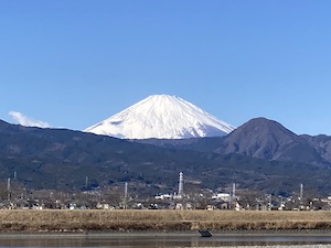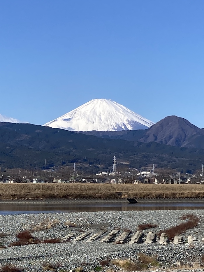 元日、小田原の工場から土手に上がって撮った富士山。