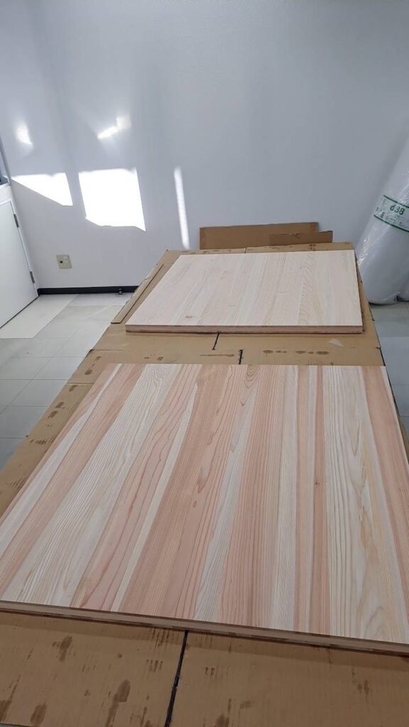 火災で多くの商材を失ったことを知り、小田原箱根産間伐材ヒノキを使ってサブロクサイズのベニヤ板サンプルを
