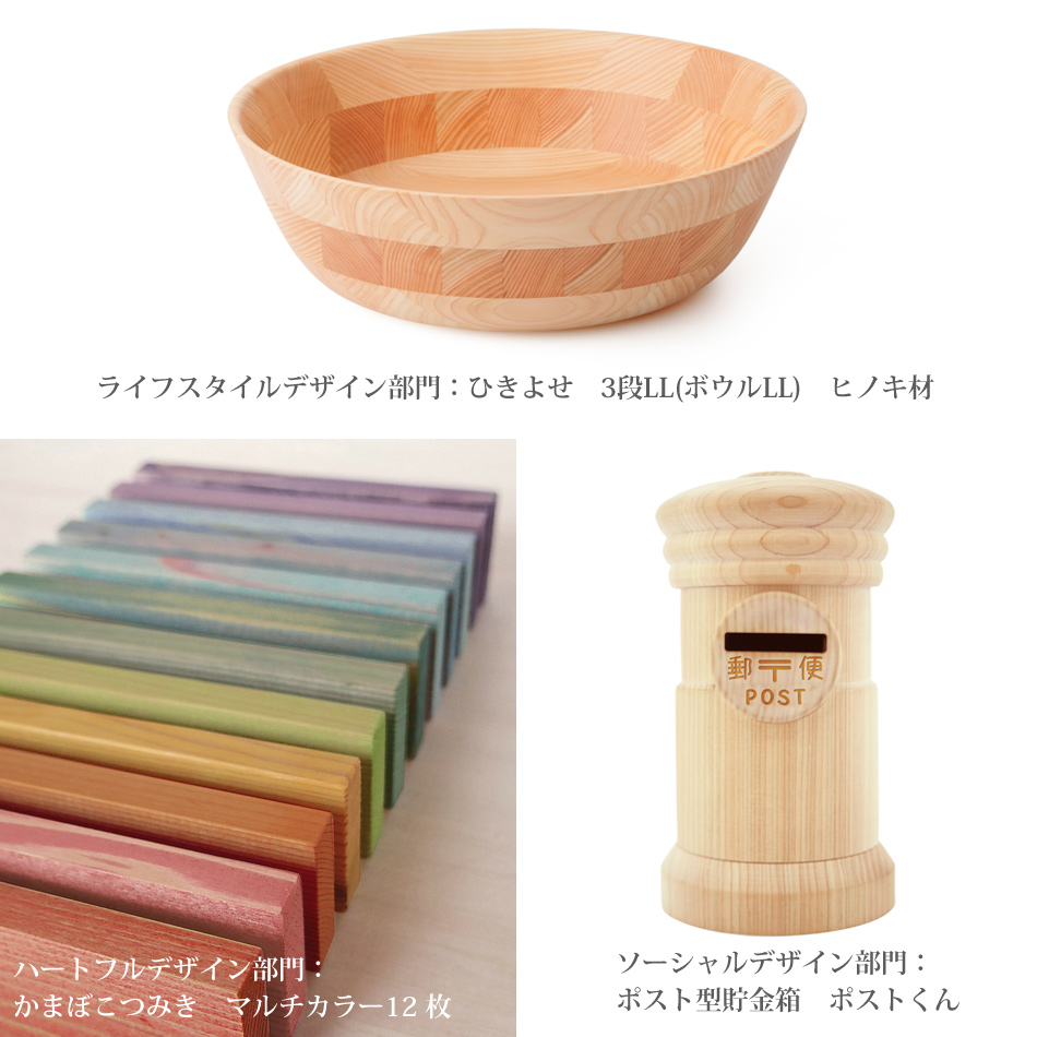 「木を使って暮らしの質を高めているものが対象」となっているライフスタイルデザイン部門では『ひきよせ』、「木を使って人の心を豊かに、身体を健やかにしているものが対象」となっているハートフルデザイン部門では『かまぼこつみき マルチカラー』、「木を使って地域や社会を活性化しているものが対象」となっているソーシャルデザイン部門では『ポスト型貯金箱 ポストくん』が入賞しました。